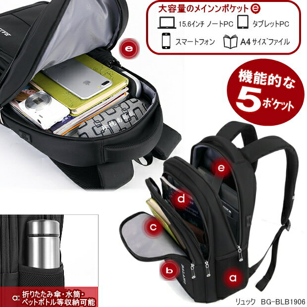 商品名 BALANG ビジネスバッグ リュックサック 品番 BLB1906 サイズ 外寸約:タテ46cmxヨコ37.5cmx奥行17cm 重さ:約)950g 仕様 A4サイズファイル、15.6インチのノートパソコン収納可能 イヤホン通し穴、ポケット内にキーホルダー付 中国製 材質 外装-1680Dバリスティック ナイロン/内装-ポリエステル ※簡易的な耐水加工であり、完全防水ではありません。